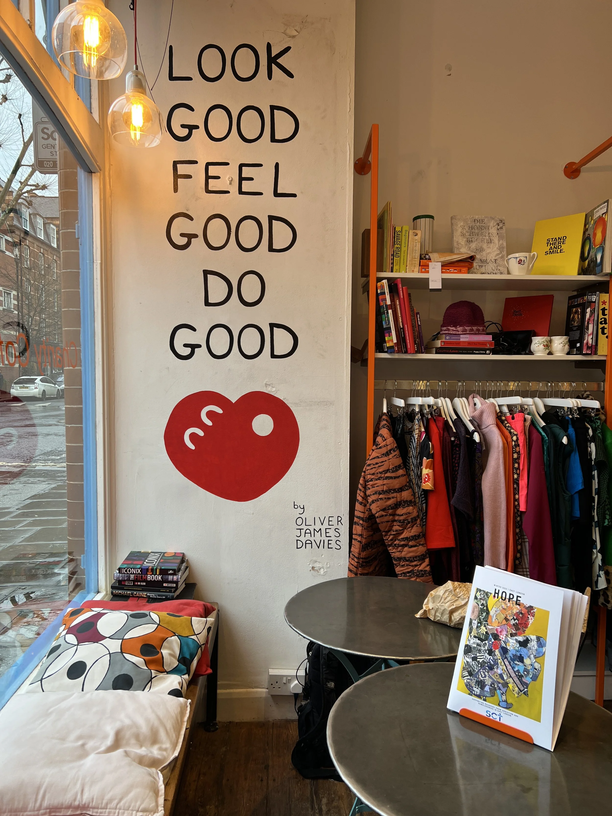 The manager of Paper & Cup saw one of my “LOOK GOOD, FEEL GOOD, DO GOOD” posters around Shoreditch, found my email and asked if I would paint two large pieces on to the walls inside the coffee shop.